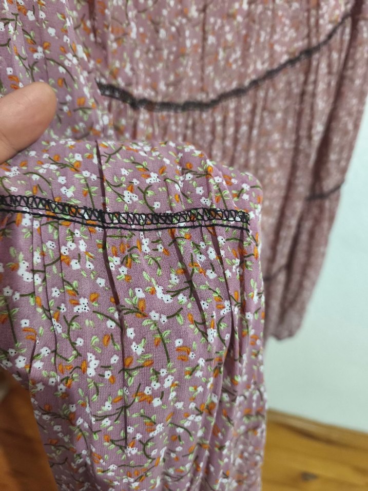 Pembe renkte, nakışlı çiçek desenli, pilili ve bol kesim eteği. Yumuşak dokulu kumaştan, günlük kullanım için uygundur.