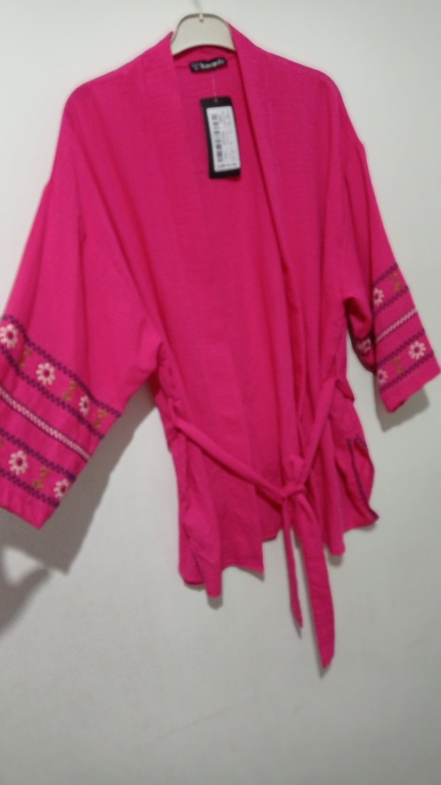 Pembe renk, uzun kollu, bol kesim Kollarında renkli nakış detayları ve belde bağlama ipi bulunur. Midi boyda.