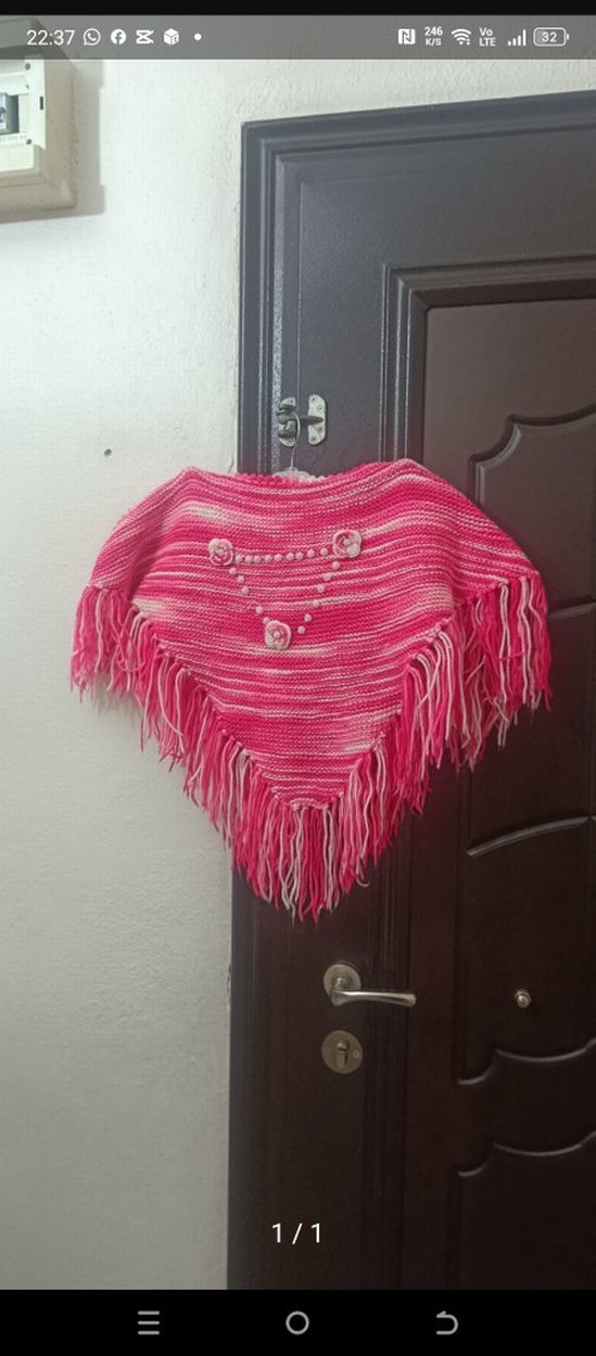 Pembe renkli, nakışlı ve püsküllü kenarlara sahip kız çocuk pançosu. Kayık yaka, askılı kol ve bol kesim ile bohem tarzını yansıtıyor.