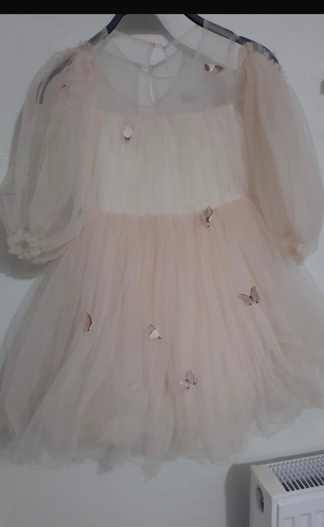 Yumuşak sentetik kumaştan, nakışlı kelebek desenli, fırfırlı, askılı kollu ve yuvarlak yakalı, bol kesim pembe kız elbisesi.
