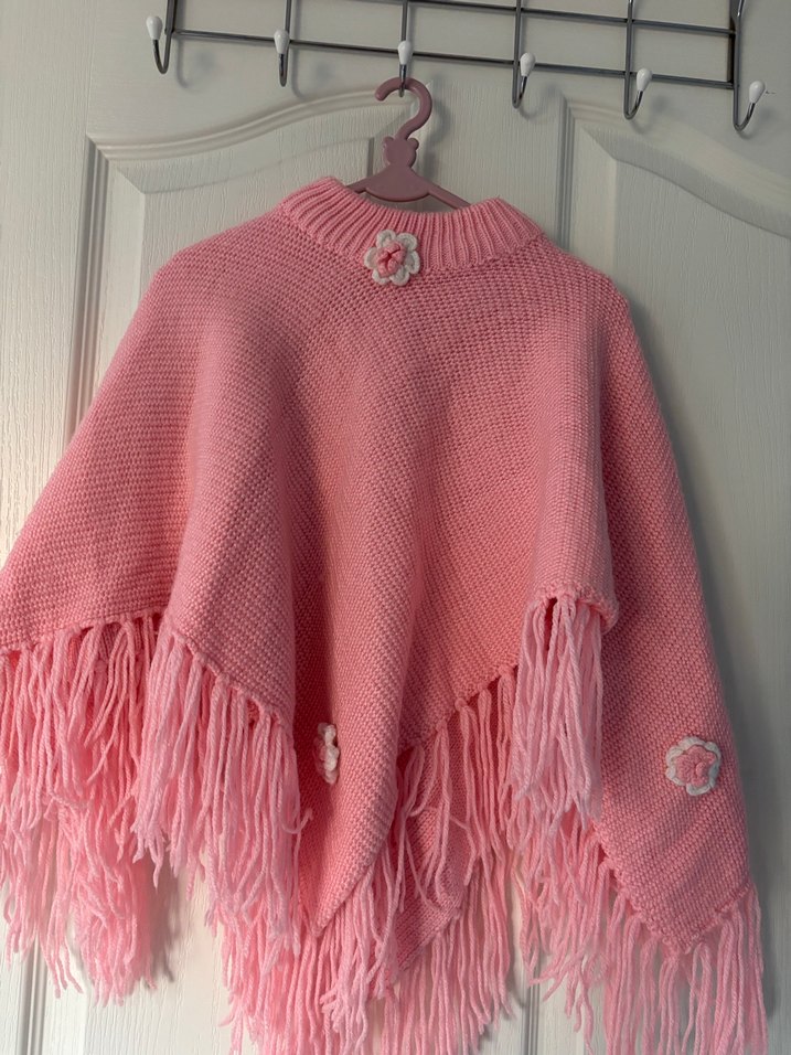 Pembe renkli, nakış detaylı, uzun kollu ve salaş kesim bohem tarzı kız panço. Püsküllerle süslenmiştir.