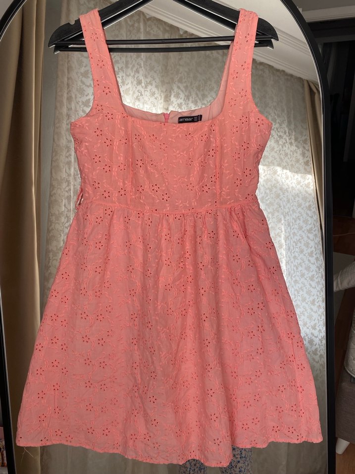 Kolsuz, pembe midi elbise, nakışlı dantel desenlere ve vücuda oturan kesime sahiptir. Kare yaka ve yumuşak sentetik kumaştan yapılmıştır, romantik akşamlar için bohem vintage tarzında idealdir.