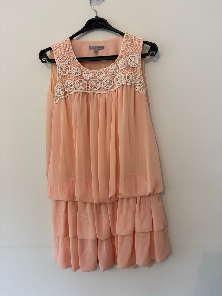 Nakışlı detaylar ve fırfırlı katmanlarla süslenmiş, kolsuz ve bol kesimli pembe mini elbise. Bohem düğünler için uygundur.