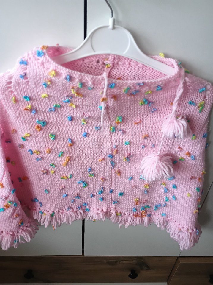 Pembe renkli, uzun kollu, bohem tarzda, renkli nakış detaylı, bol kesim örgü kız hırkası.