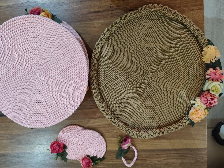 Bohem tarzda, pastel pembe nakış detaylı, doğal dokuma görünümlü sofra seti. Peçetelik ve bardak altlıkları içerir.