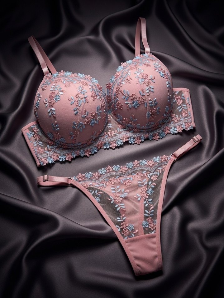 Pembe renkte, pastel renkli nakışlı çiçek desenleriyle bohem stilinde sütyen takımı. Normal uzunlukta sütyen ve uyumlu külot içerir, göz alıcı bir görünüm sunar.