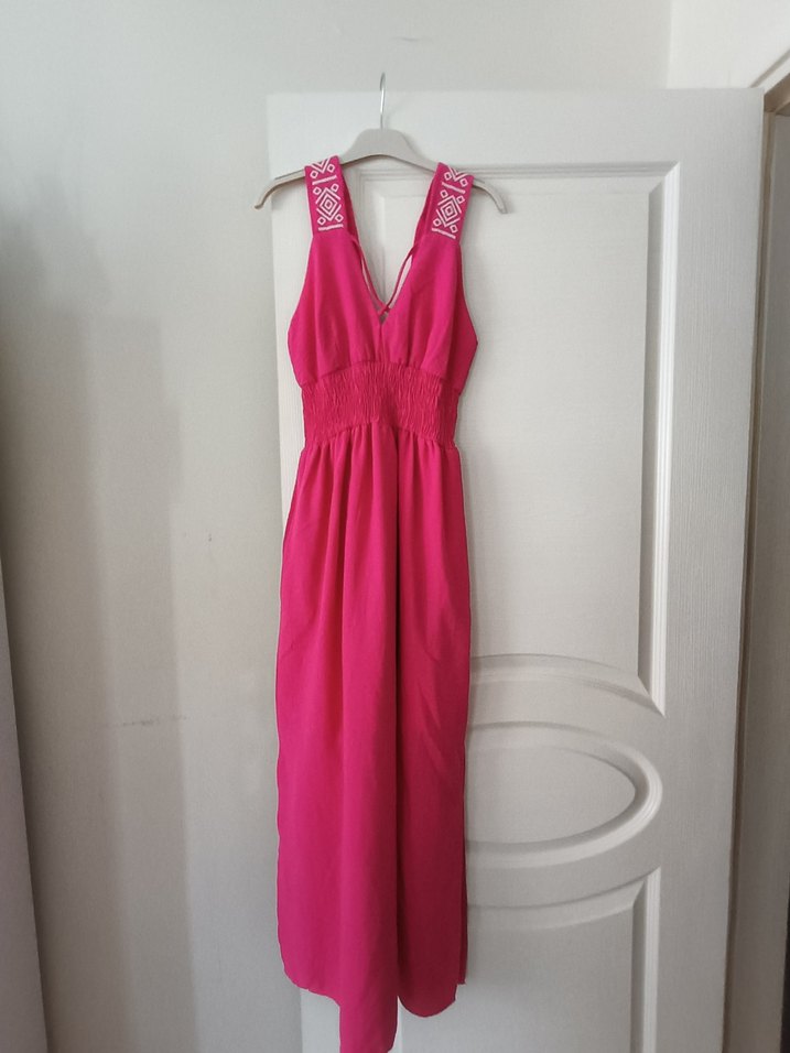 Pembe renkli, V yaka, kolsuz bohem uzun elbise. Nakış detaylı ve bol kesim, romantik akşamlar için uygun, yumuşak sentetik kumaş.