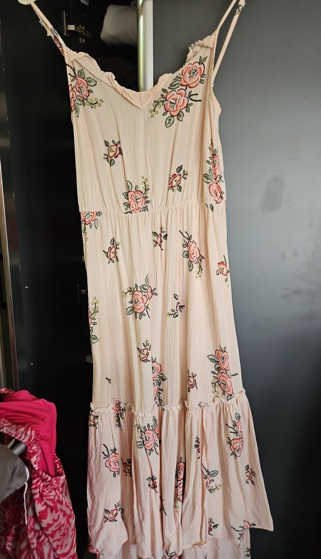 Straplez yaka ve fırfır detaylı, uzun ve bol kesim elbise. Sentetik kumaştan, pastel pembe renkte nakışlı çiçek desenleri bulunur.