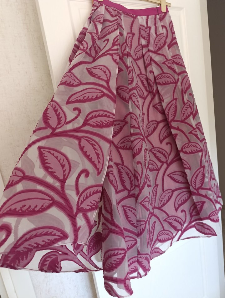 Pembe nakışlı yaprak desenleriyle, gri sentetik kumaştan, bohem tarzda, uzun ve bol kesim bir etek.