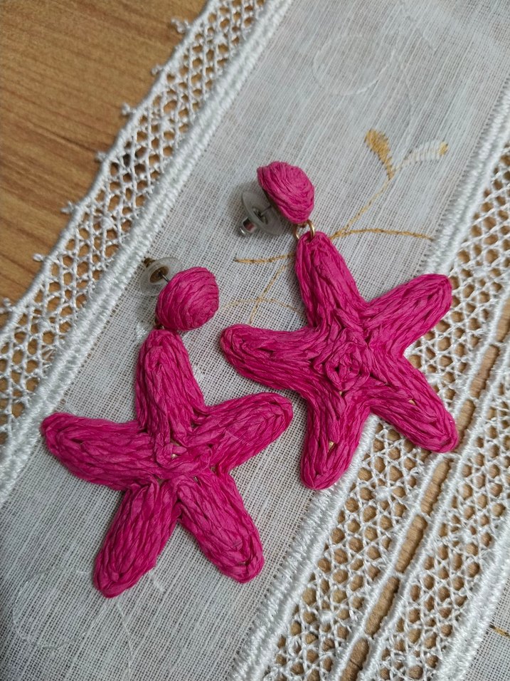 Pembe nakışlı, boncuk detaylı yıldız şeklinde bohem tarzda küpeler. Renkli ve midi boyda, parti için uygun.