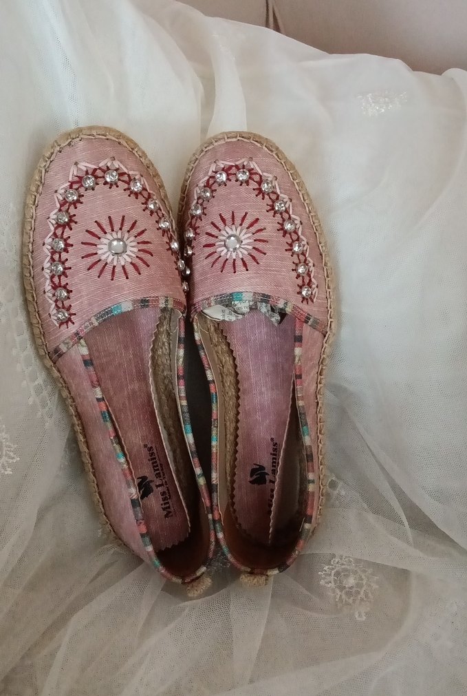 Pembe renkli, nakış ve boncuk detaylı espadril. Günlük kullanım için uygundur.