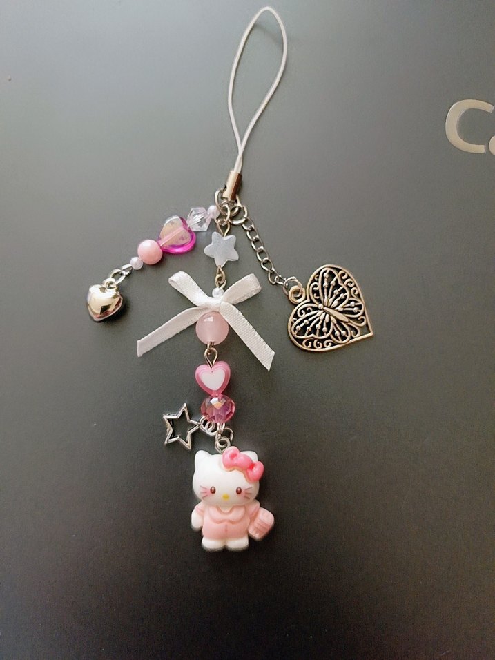 Pembe pastel boncuklar, nakış detayları, kalp ve yıldız figürleriyle süslenmiş kadın charm. Pembe fiyonk ve küçük Hello Kitty figürü içerir.