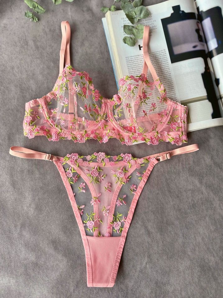 Pembe nakışlı, şeffaf kumaş üzerinde çiçek desenli bohem tarzda sütyen ve tanga takımı. 90C-95C