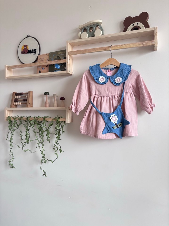 Ürün bedenleri: 1 yaş, 2 yaş, 3 yaş, 4 yaş nakışlı, bebe yakalı, uzun kollu ve bol kesim kız elbisesi. Yanında küçük denim çanta bulunur.