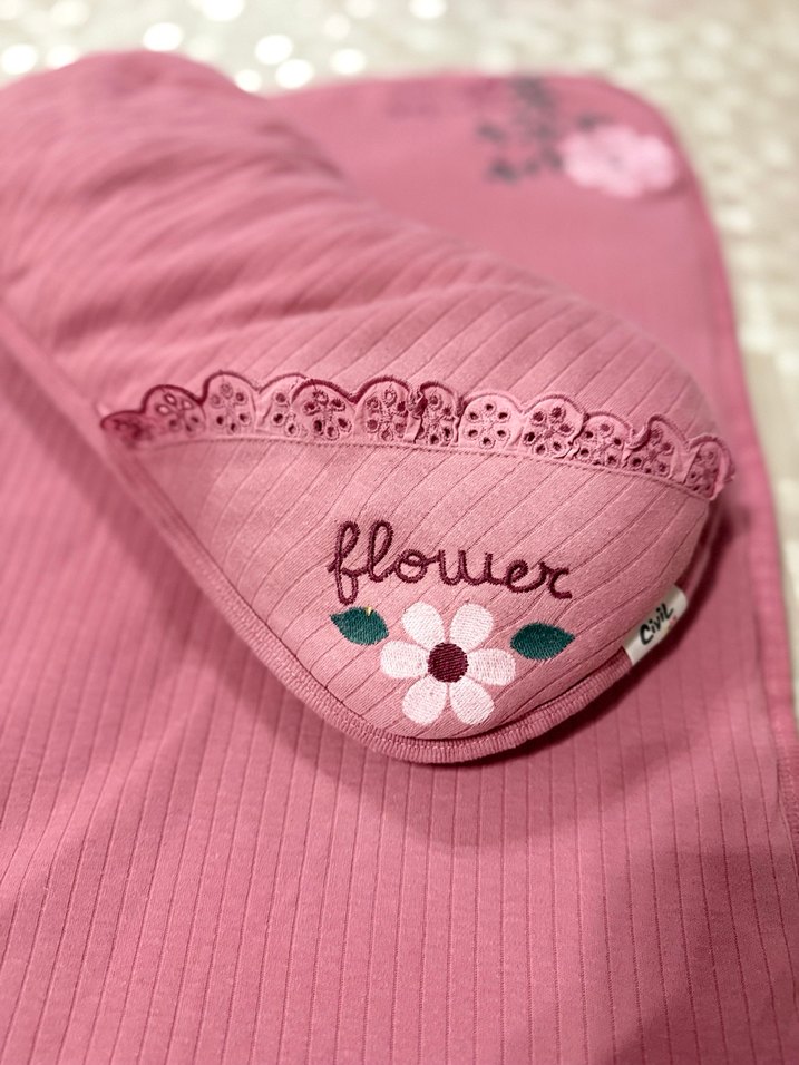 Yumuşak sentetik kumaştan yapılmış, pastel pembe çocuk yastığı, nakışlı çiçek ve dantel detaylarıyla süslenmiştir.