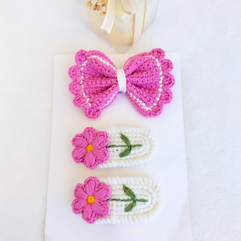 Pembe nakışlı fiyonk ve beyaz zemin üzerine pembe çiçek işlemeli, bohem tarzda saç tokası seti.