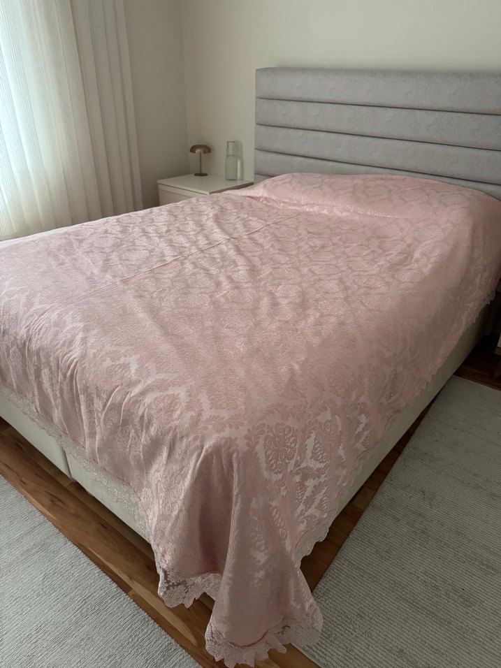 Yatak örtüsü ve 2 adet yastık kılıfı var. Hiç kullanılmadı. Çeyizime hediye gelmişti sadece kutusunu attım. Kenarları dantel detaylıdır. ÖLÇÜLERİ: yastık kılıfı 76x52, yatak örtüsü 250x230 Pastel pembe renkte, zarif nakış desenlerine sahip yatak örtüsü. Yumuşak dokusu ve şık görünümüyle yatak üzerinde hoş durur. ️