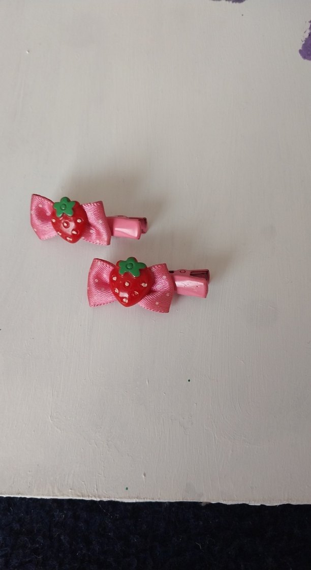 Nakışlı fiyonk ve çilek figürlü pembe çocuk saç tokaları.