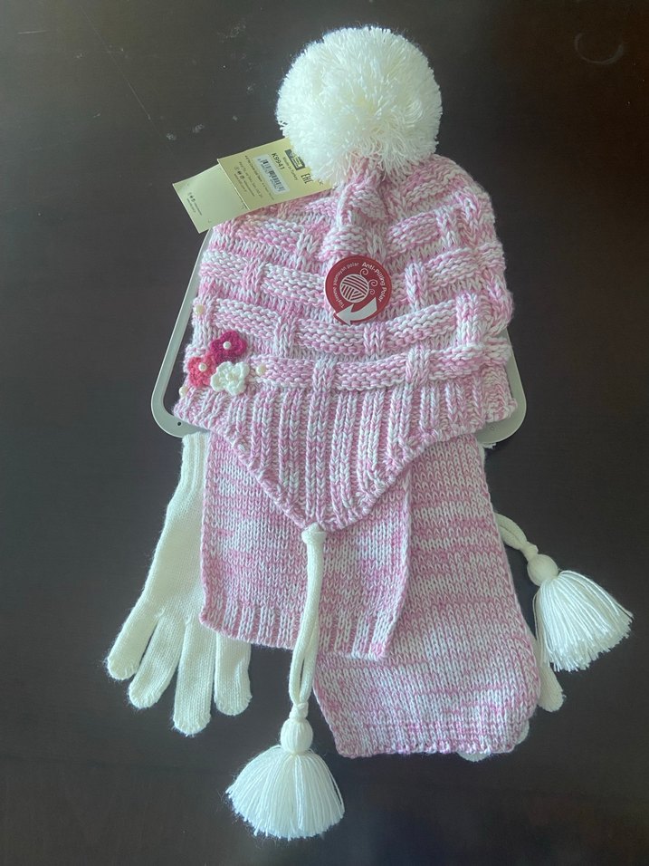 Pembe beyaz atkı, ponponlu nakışlı çiçek detaylı bere ve eldivenlerden oluşan çocuk seti ❄️