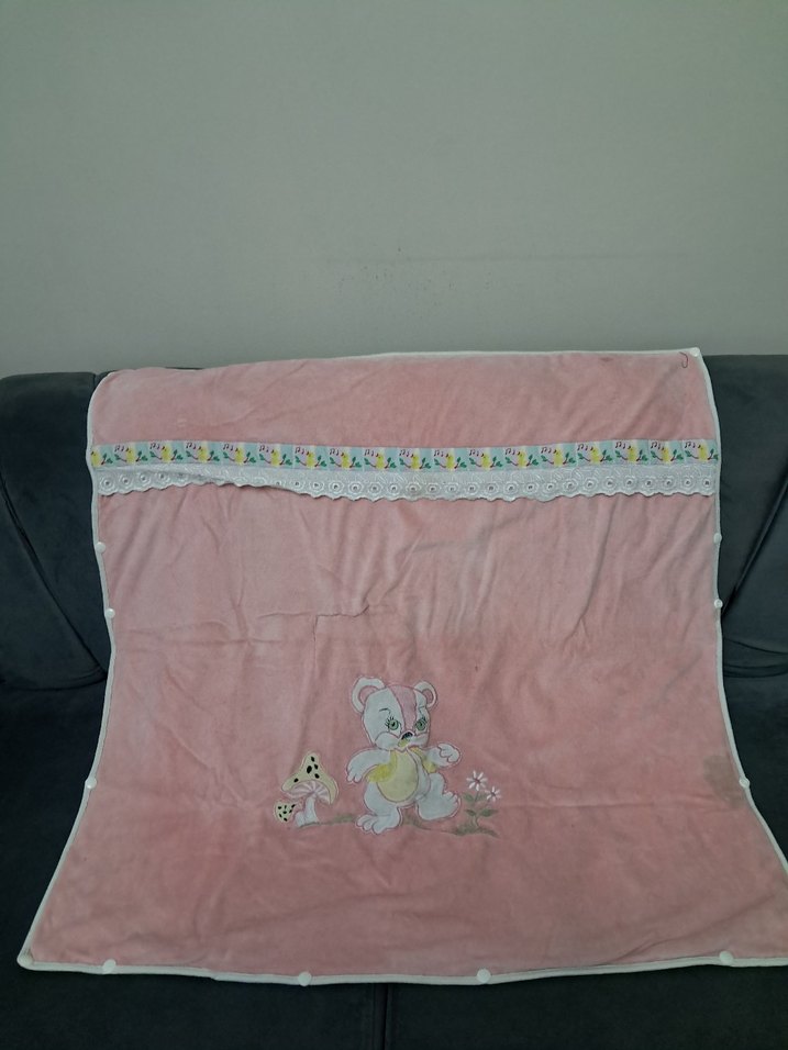 Yumuşak pembe çocuk battaniyesi, nakışlı ayı ve mantar desenleriyle, pastel süsleme şeridi ve dantel detaylı. Çocuklar için rahat ve nazik kumaş. lekesi var, dikiş var, kullanmaya engel değil, günlük kullanılabilir ,rengi yavruağzı