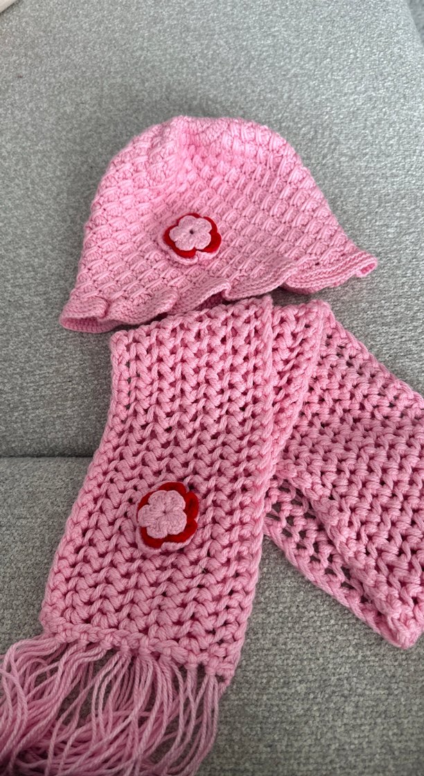 Pembe renkli, nakışlı çiçek detaylı çocuk bere ve atkı seti, yumuşak ve rahat örme kumaştan, bohem tarzda.