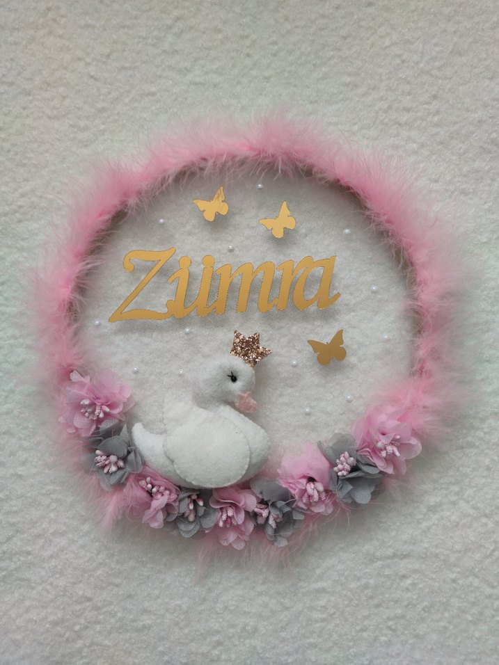 Nakışlı detaylar, peluş kuğu ve çiçek süslemeleriyle yumuşak ve sıcak pembe çocuk odası kapı süsü.