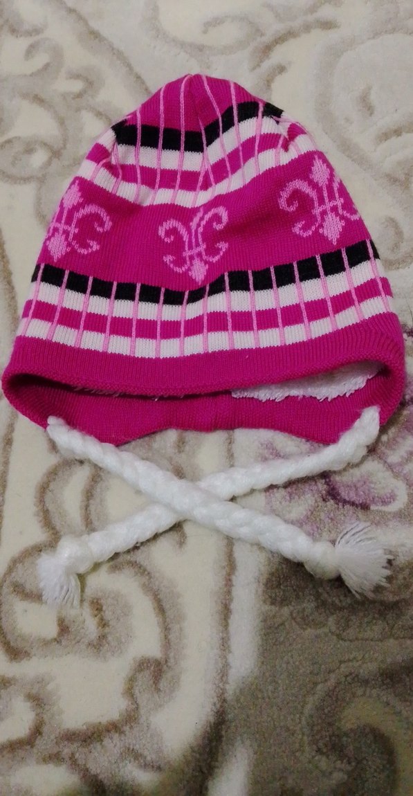 Renkli pembe nakışlı çocuk örgü bere, yumuşak fleece astarlı ve örgü püsküllü detaylara sahip.