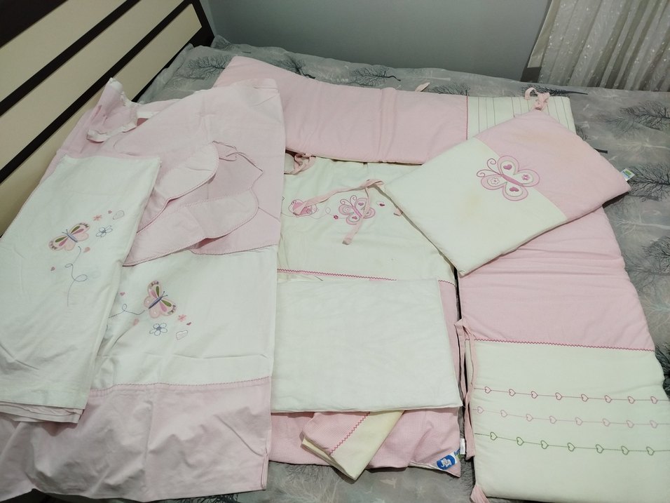1adet bebek yorganı, beşik tan koruyucu️, 1adet bebek nevresim takımı, 2tane fon perde ve aparatları