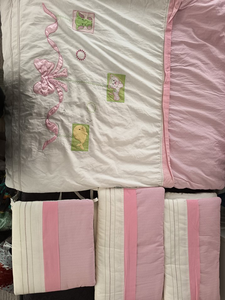 Pastel pembe renkte, nakışlı hayvan desenleri ve kurdele detayı bulunan yumuşak çocuk uyku seti.