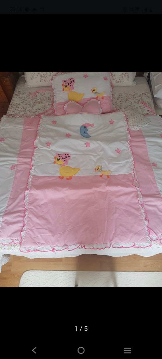 Pastel pembe sentetik kumaştan yapılmış, ördek ve ay nakışlı çocuk uyku seti. Yastık ve yorgan 3tarafi korumaliklari vardır.Baş bölgesinde bulunan bağlama ipinin alt tarafında olan ipi yok sadece onun dışında bişey yok tertemiz lekesiz bir set.