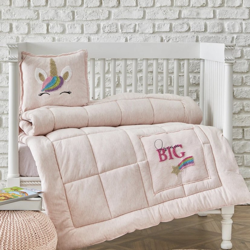 Pastel pembe pamuklu çocuk uyku seti, nakışlı unicorn yastık ve "Dream Big" yazılı battaniye ile yumuşak ve rahat bir uyku sağlar. Sıfır ürün çantasında.