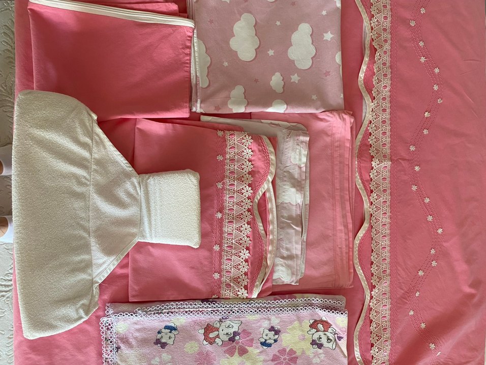 Ayıcılık battanıye 90x90 Yorgan kılıf 92x112 3 adet Yastıklar 32x44 Yatak kılıf bebek beşik 85x50 Park yatak kılıf 62x 120 Yan yatırma yastığı Temiz kullanıldılar Yırtık yok ama ufak görünmez leke var yastıkta Park yatak ve anne yanı beşik ölçüsüyle özel diktirildi 4 yaşa kadar beşiği bırakana kadar kullanıldı hatta kreşe bile yolladım solma yıpranma olmadı kumaş kalitesi ömürlük