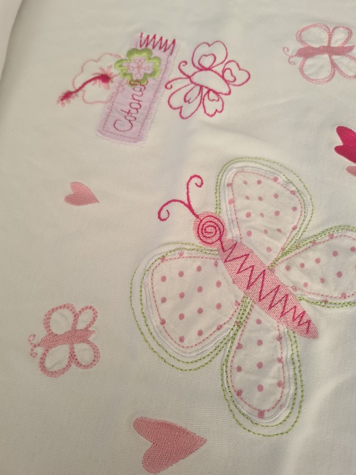 Yumuşak kumaş üzerine işlenmiş pastel pembe kelebek ve kalplerle süslenmiş çocuk uyku tekstili. kız çocukları için battaniye çok az kullanıldı temiz huzursuz fiyatı uygun 40 TL