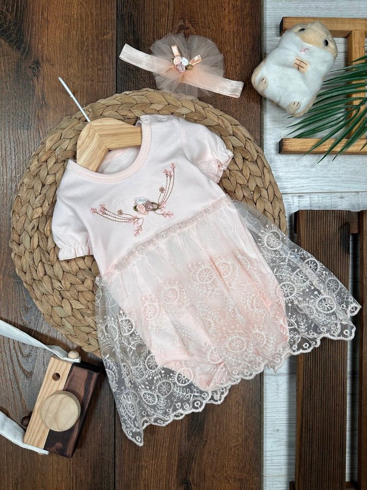 Pembe Nakışlı Dantel Detaylı Kız Elbise