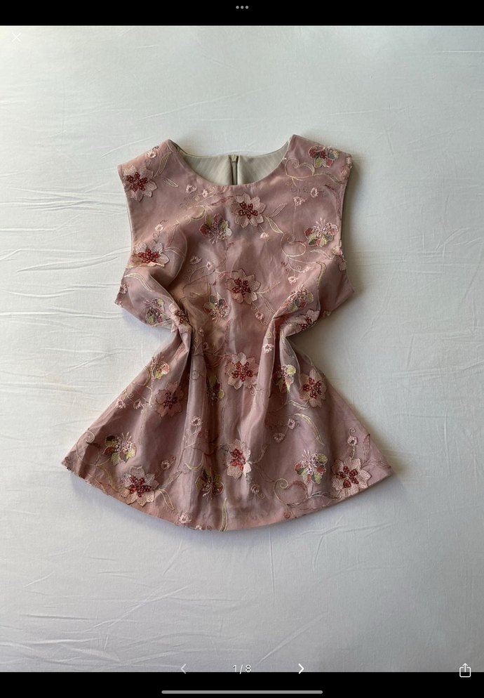 Nakışlı çiçek desenli, dantel detaylı pembe kolsuz bluz, bol kesim ve straplez yakaya sahip, bohem tarzda.