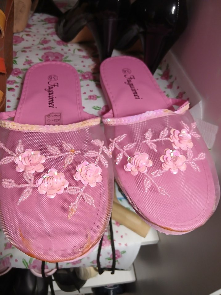 Pembe renkte, dolgu topuklu kadın terlik. Nakışlı çiçek desenli dantel detayları ve sentetik kumaştan yapılmıştır. Vintage tarzda, düğünler için uygun.