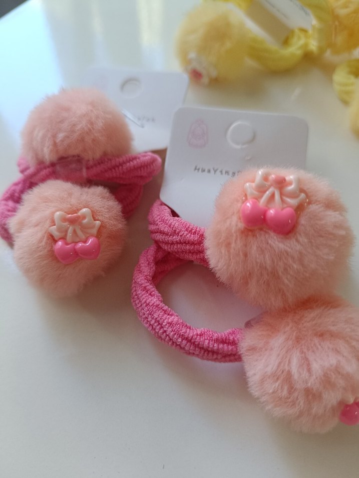 Pembe elastik çocuk saç tokaları, yumuşak ponponlar ve nakışlı fiyonk detaylarıyla renkli bir görünüm sunar.