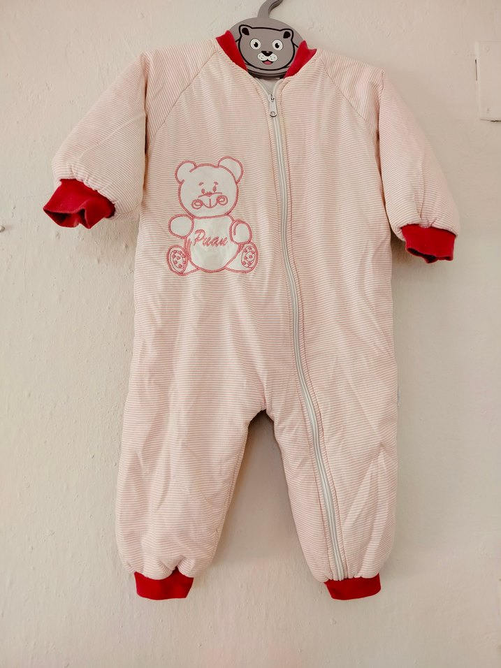 Pastel pembe renkli, fermuarlı bebek tulumu. Nakışlı ayı deseni ve kırmızı manşetler bulunur. 'Paa' yazısı yer alır. ❄️ uzunluğu 68 cm