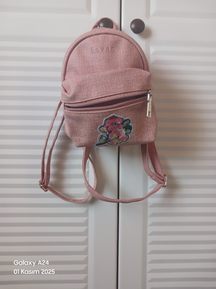 Pembe renkte, nakışlı çiçek desenli ve fermuarlı ön cepli sırt çantası. Sentetik kumaştan, bohem ve retro tarzlara uygun, günlük kullanıma ideal.