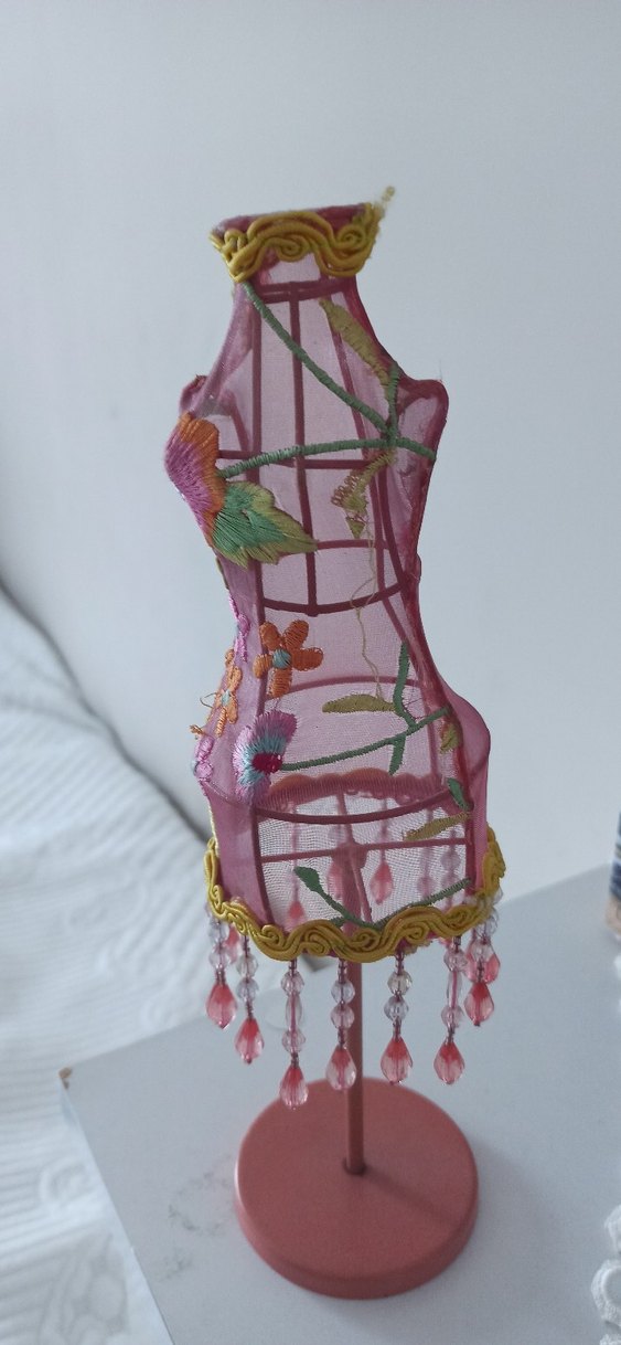 Pastel pembe renginde, renkli nakışlı çiçekler ve pembe boncuklar ile süslenmiş zarif bir figür