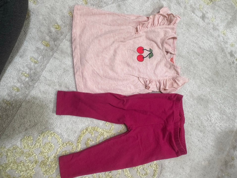 Pastel pembe uzun kollu, kiraz nakışlı ve fırfırlı üst ile koyu pembe pantolon içeren bebek kız takımı.