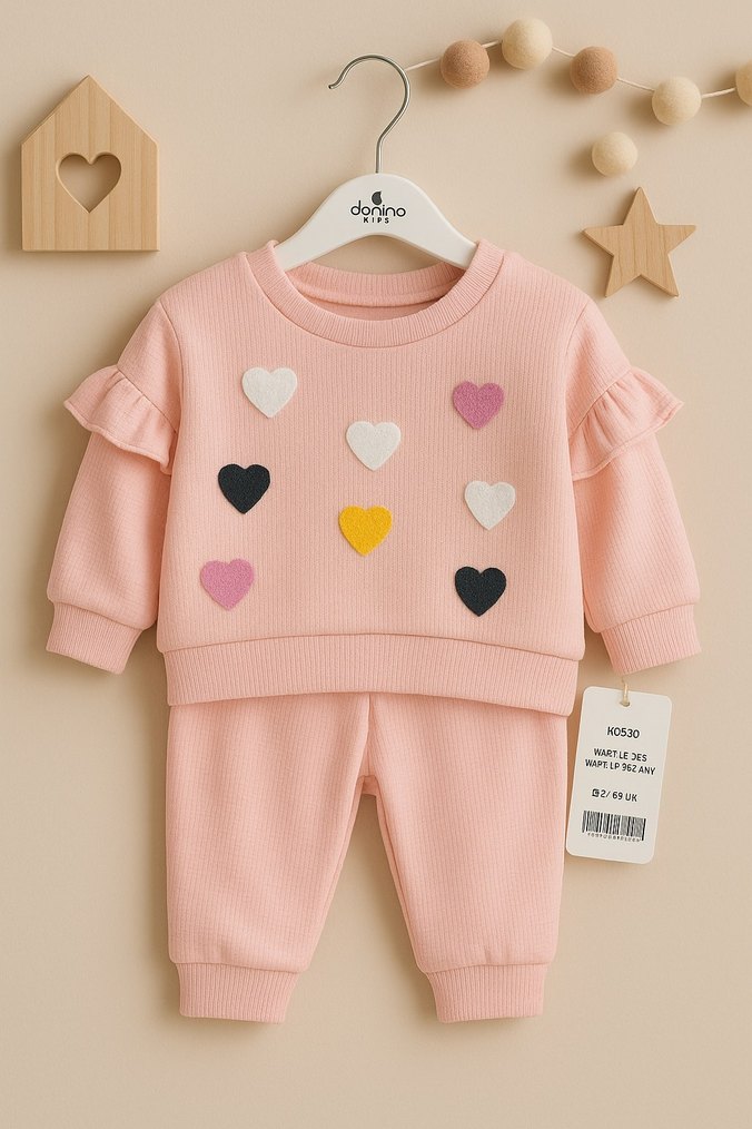 Uzun kollu, fırfırlı detaylı ve nakışlı kalp desenli pastel pembe bebek kız takımı. Yumuşak ve rahat kumaş.