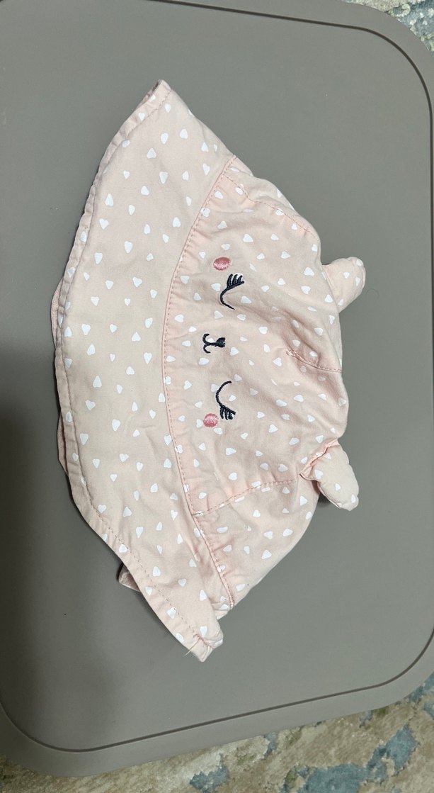 Pastel pembe renkte, nakışlı göz ve yanak detaylarıyla, küçük kulaklı ve fırfırlı çocuk şapkası. Yumuşak sentetik kumaştan üretilmiştir.