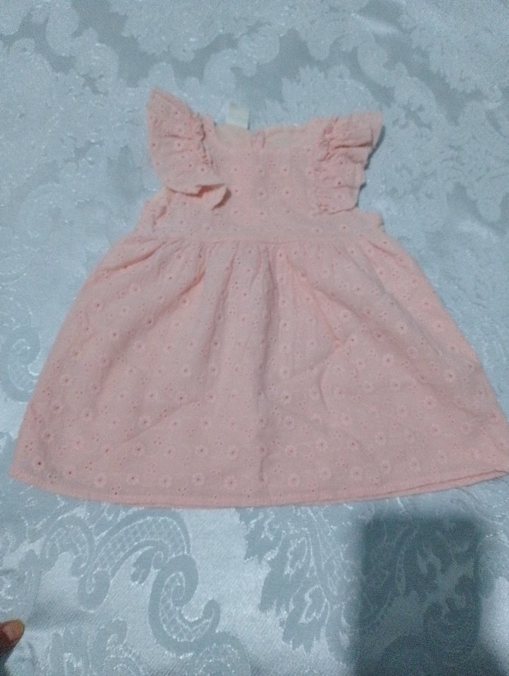 Pembe pastel tonlarda, nakışlı desenli, fırfırlı kolsuz straplez yaka ve bol kesim kız elbisesi. 9-12 aylık