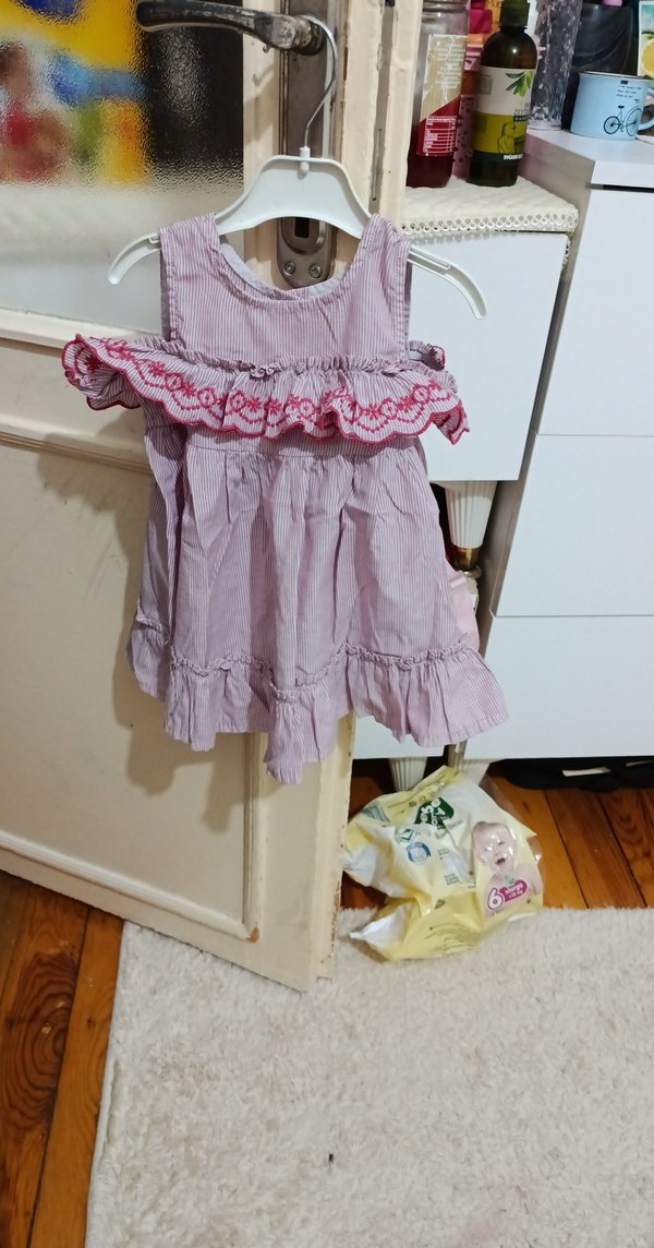 Kolsuz, pembe renkli kız elbisesi nakışlı ve fırfırlı detaylara sahiptir. Askısız yaka ve bol kesimlidir, yumuşak tekstil kumaştan yapılmıştır, bohem tarzı için uygundur.