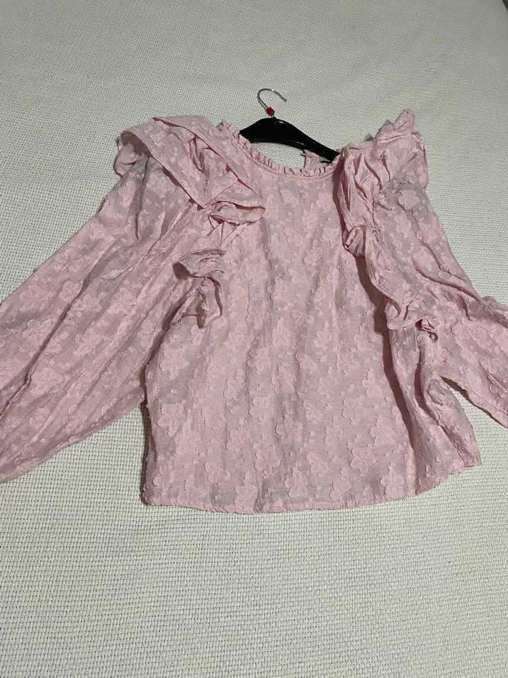 Pembe keten kumaştan, nakışlı ve fırfırlı uzun kollu, V yakalı, bol kesim kısa bluz. Rahat ve bohem tarz için uygundur.