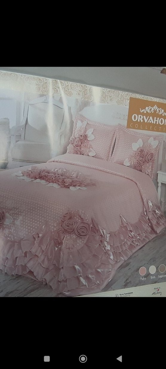 Pastel pembe renkte, nakışlı çiçek desenleri ve fırfırlı kenarları olan yatak örtüsü. ORVAHO markalıdır.