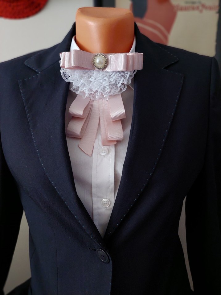 İnci detaylı, dantel süslemeli pastel pembe nakışlı fiyonk broş. Ofis kıyafetlerine gotik ve zarif bir dokunuş katar.