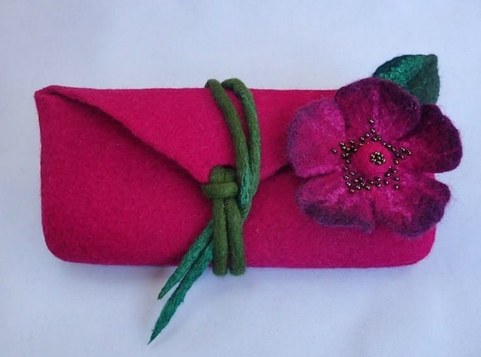 Yumuşak pembe keçe üzerinde renkli nakışlı fiyonk detaylarına sahip kadın el çantası, romantik akşamlar için bohem ve rahat bir tarz sunar.