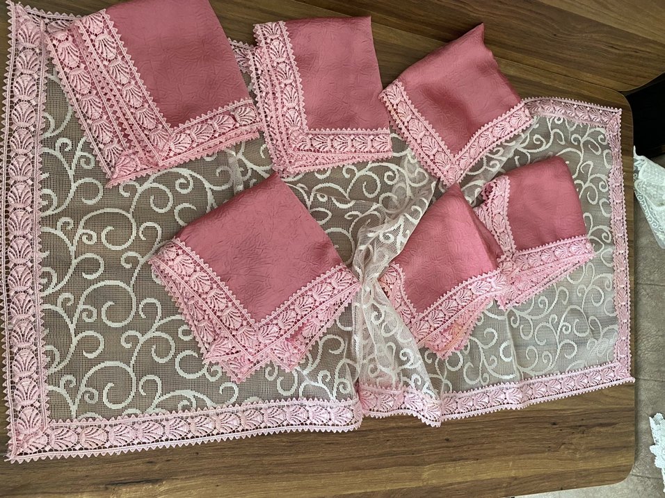 Hafif pembe renkte, nakışlı kenarlara ve geleneksel stile sahip, zarif dantel desenli masa örtüsü. ️peceteler ve ranir